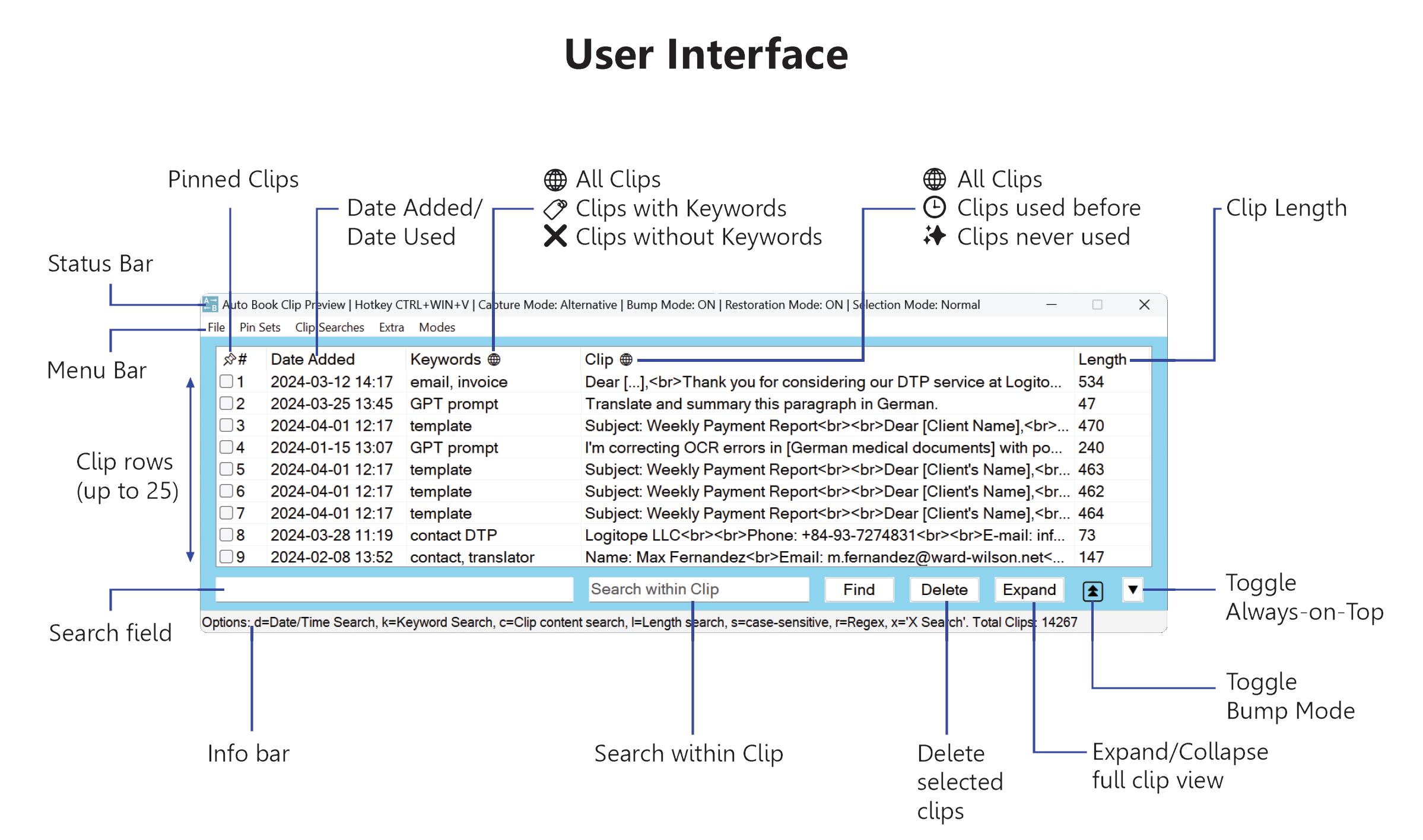 The Clip Preview is the main interface for interacting with the Clip Manager, allowing you to run searches, paste clips, load pin sets, and perform many other functions.