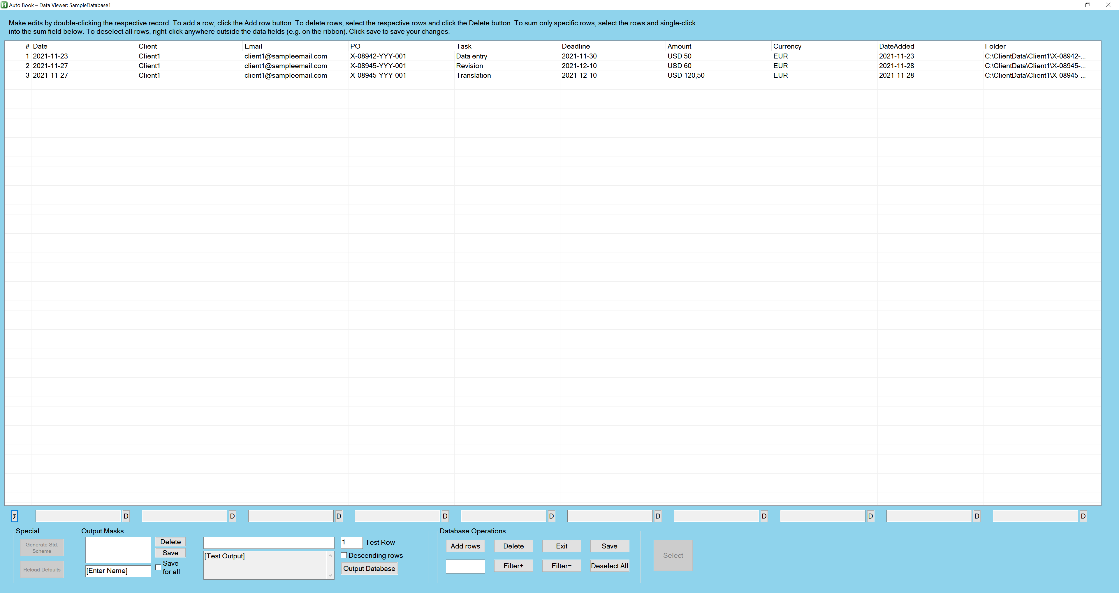 Output Masks allow you to define patterns to arrange your Database data into an arbitrary format, including only the specified columns. This way, you can format your data in a way that allows you to paste them into an invoice template or accounting cloud-system, for example.