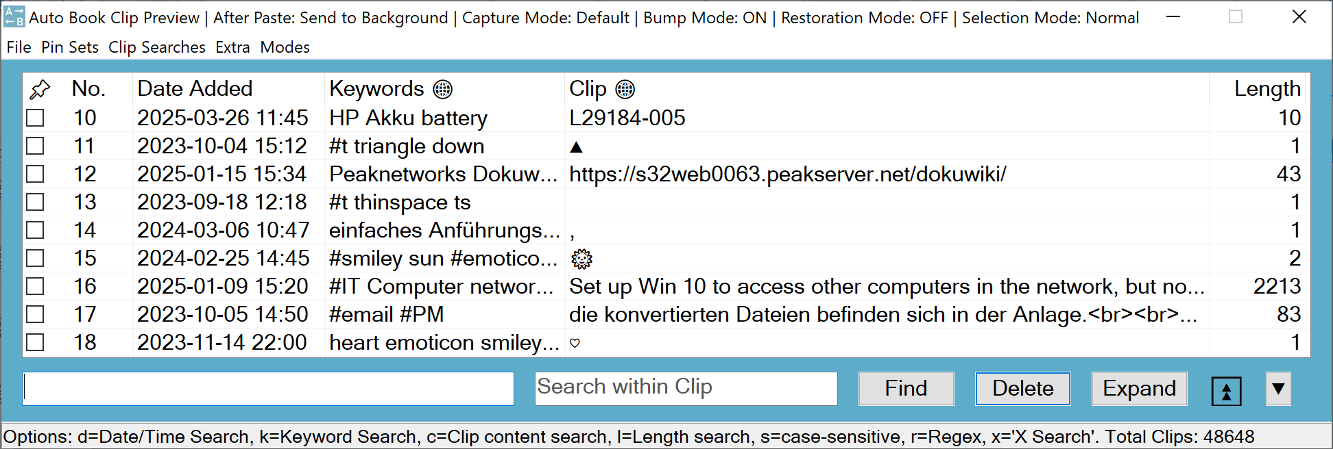 Edit your clips without keywords in clip.txt.ab and clips with keywords in prioclips.txt.ab. Both are plain text files, with individual clips separated by linefeeds. Each line, representing one clip, consists of four columns that are separated by tabulators. Both files have the same four columns – Date Added, Date Used, Keywords, and Clip Content –, but in clips.txt.ab, the Keywords column is always blank.
