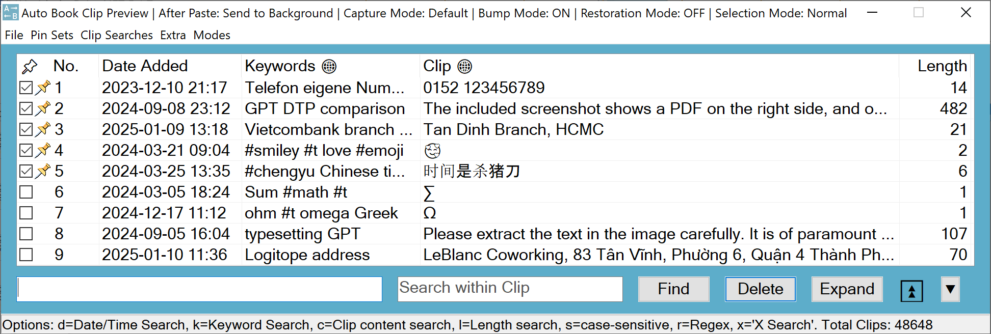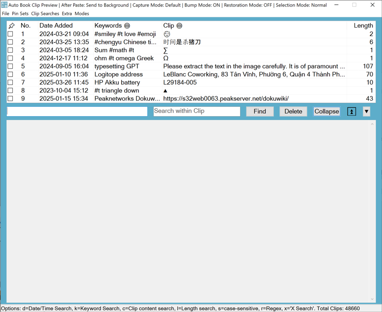 The Clip Preview hotkey opens the Clip Preview with a list of previously captured clips. This is the main interface for interacting with the Clip Manager, allowing you to run searches, paste clips, load pin sets, and perform many other functions.