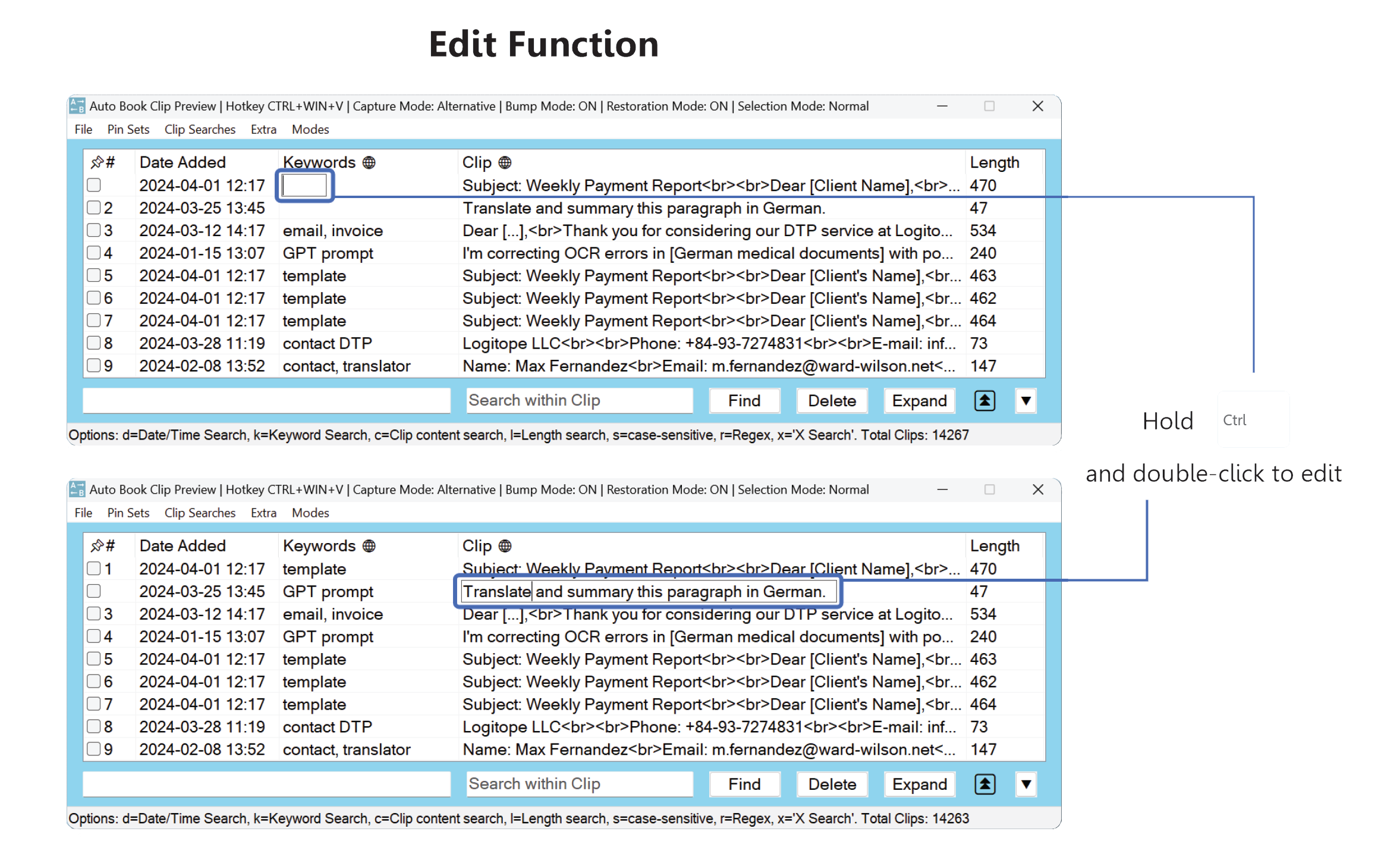 Adjust the number of visible rows in the clip table (1–25) using Ctrl