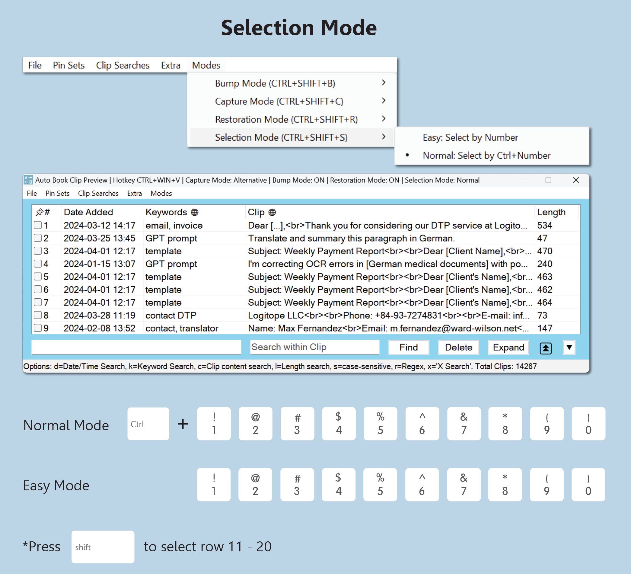 Five switchable modes let you tailor the Clip Manager’s behavior to your current workflow and are easily toggled via hotkey.