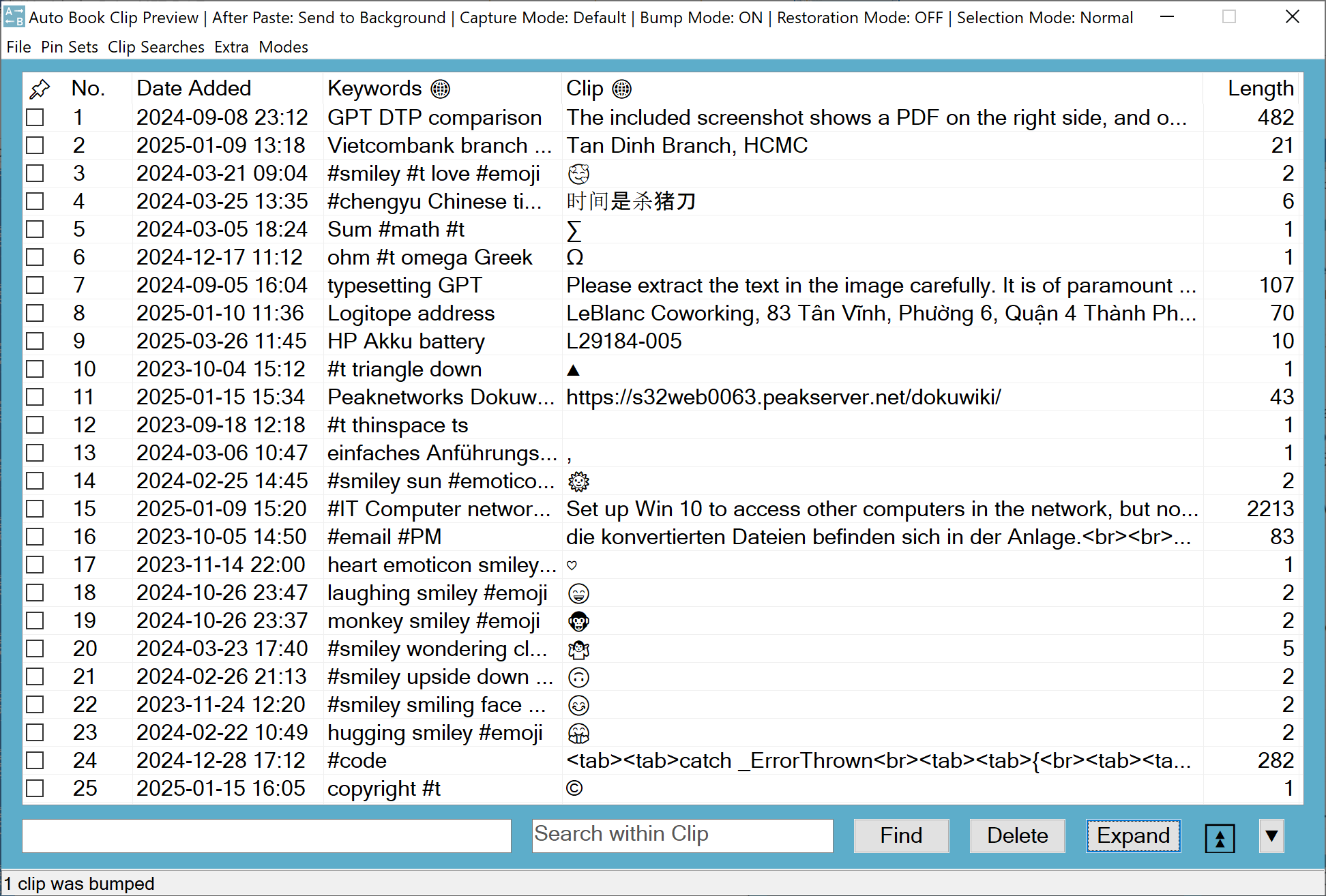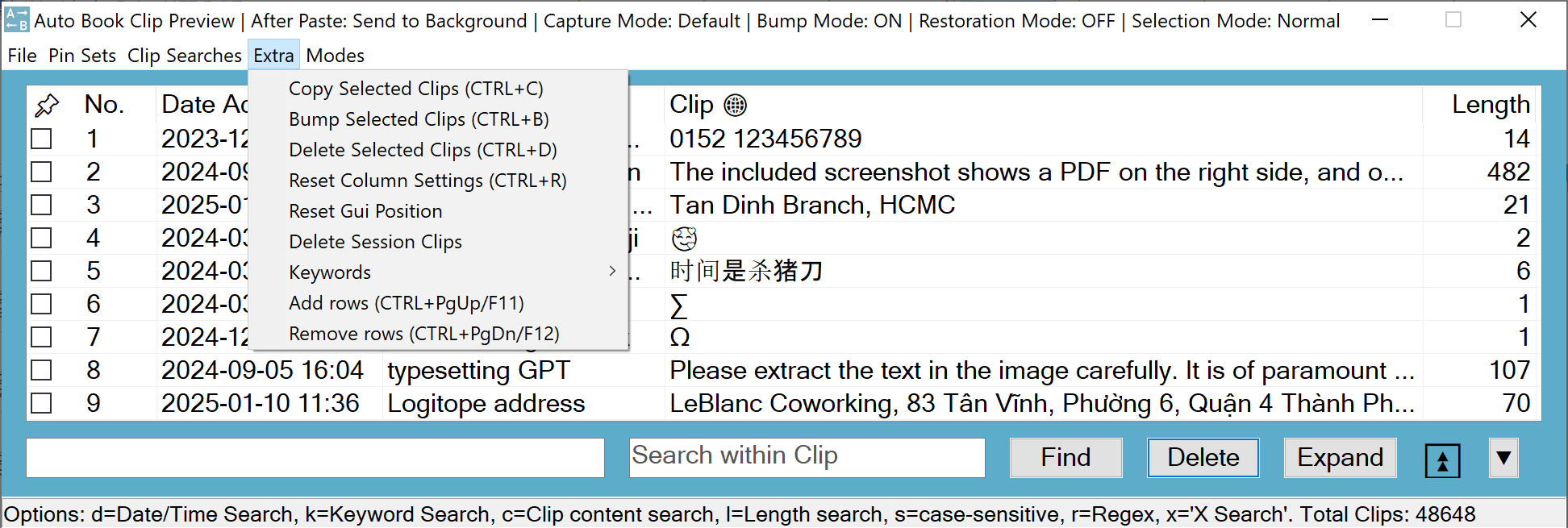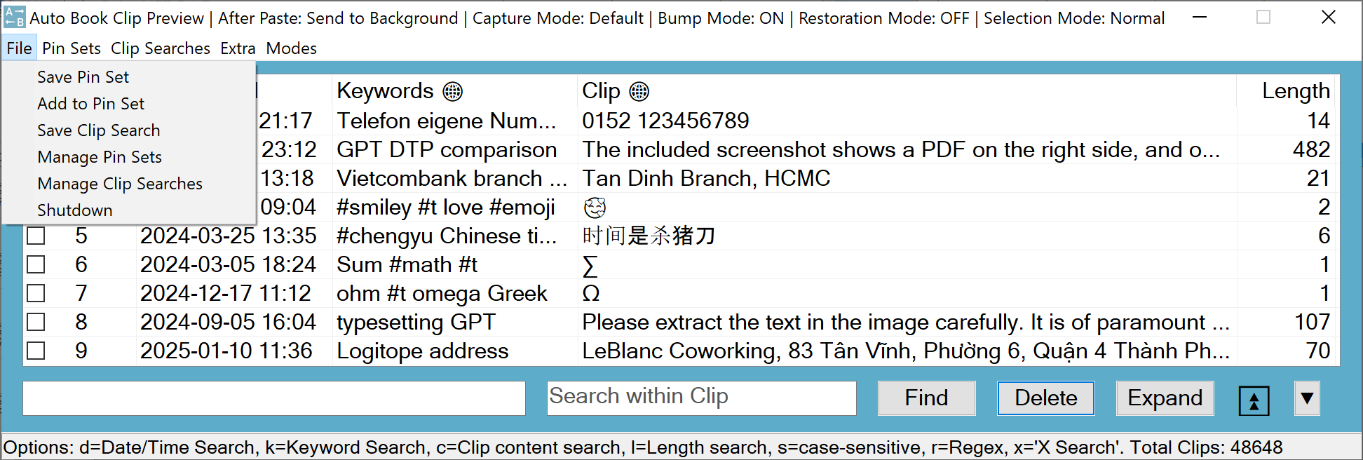 The Clip Preview hotkey opens the Clip Preview with a list of previously captured clips. This is the main interface for interacting with the Clip Manager, allowing you to run searches, paste clips, load pin sets, and perform many other functions.