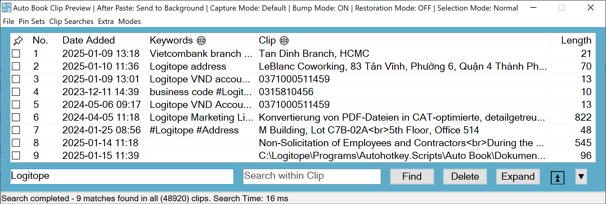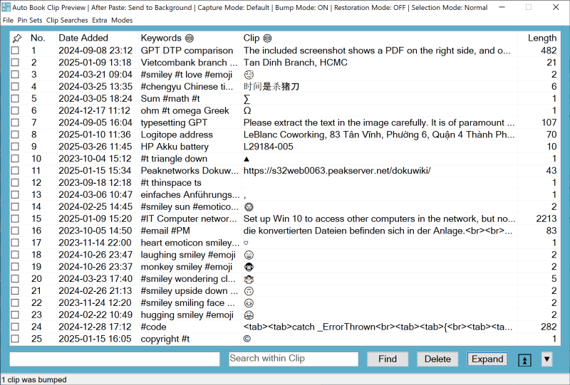 The Auto Book Clip Manager interconnects your clipboard with an infinite text repository and a flexible, powerful, extremely fast search function. It not only manages your session clips for later use but also keeps all previously clipped information available at your fingertips – for months, years and your whole life.
