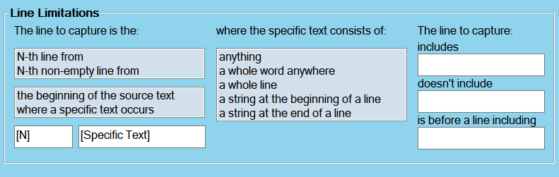 Always choose a Data Source if you want to capture any received text; that is, only leave Data Source empty if you want to leave the corresponding Database column blank or only enter Fixed Text. After picking the Data Source, you can define in which your line the text to be extracted is found via the Line Limitations group. You can further refine your settings via Sub-Line Limitations, which allow you to pick only a certain part of a line, Word Limitations, which are used to pick only words fulfilling certain conditions, and Symbol Limitations, which limit the type of symbols (characters) that will be included in the extraction result. None of these four groups are mandatory, that is, you can, for example, only use Word Limitations without defining the line in which the text to be extracted is found, and so on.