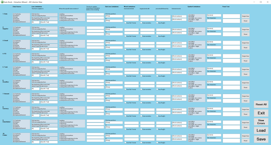 When you're done with your settings for all columns – up to 10, but you don't need to use all – click the Save button to create your Extraction Scheme. You will be able to reopen your settings and make adjustments later via the Load button.