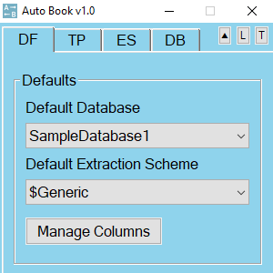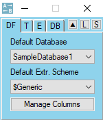 The top-left quadrant contains dropdown menus for selecting the Default Database and Default Extraction Scheme as well as the Manage Columns button.