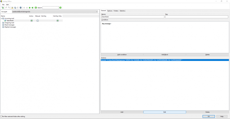 Note there are other ways to configure The Bat depending on your needs. For example, you could leave the checkbox This rule is executed only by pressing the hotkey unchecked and restrict the filter to a specific folder on the filter's Folders tab if you have a specific email folder where only purchase orders are received and you want to call Auto Book automatically whenever that happens. Or you could configure a filter that calls Auto Book automatically when a certain trigger word such as “purchase order” is included in the subject line. The Bat offers a lot of flexibility and savvy users might have other ideas.